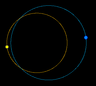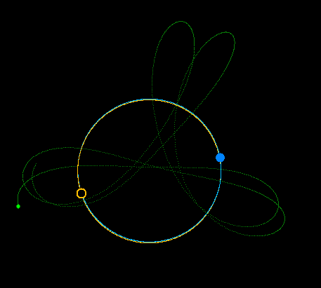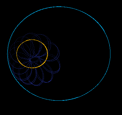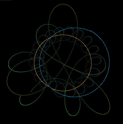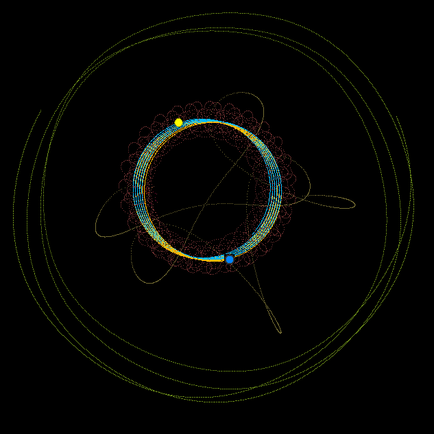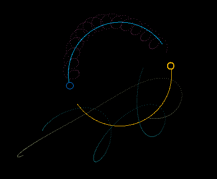 The orbits above are two stars and a planet. The yellow is largest and slowest while the turquoise has medium mass and velocity. The smaller planet is represented by the fastest moving indigo orbit. |