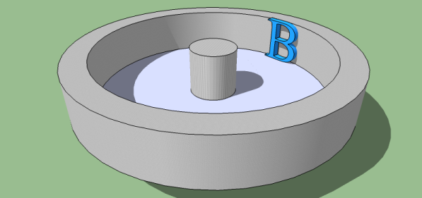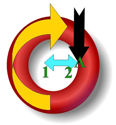 | Consider this simple diagram of an object rotating clockwise at a uniform velocity. The point at A is on the surface of the inner rim of the object. The black arrow represents the resultant force that A undergoes due to the object spinning. If A was on the outer rim, it would be thrown off in the direction of the black arrow. But as A is on the inner rim, the turquoise arrow represents the resultant tension exhibited by the molecular forces of the object on A due to friction. A wants to move down, but due to the curve of the red surface, it is pulled to the left (1), and it feels a force pulling back at it (2) which is the typical centrifugal force. This seems fairly obvious. But let me take it further. |