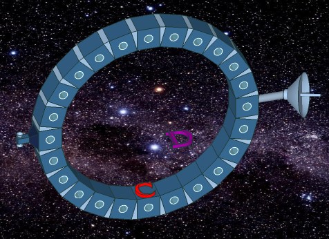 | B is a typical fairground attraction. A person at position B is pulled to the inner rim by the force of the spinning object acting on the air through friction. The air in contact with the surface wants to move in the same manner as the black arrow in diagram A. But due to the air being in contact with other air which is in contact with the rim, all the air within the spinning object is subject to the centrifugal force. The air nearest the middle of the circle experiences less centrifugal force due to the rotational velocity being less. The inner rim forces the air into a circle so anything in contact with the air is pulled along with it. This is why one sticks to the rim at the fairground. The air inside the spinning object is behaving according to the same set of vectors as A. Eventually as the spin increases, gravity itself is not as strong as the force of the air sticking the person to the inner rim at position B and so gravity is overcome. The only differences between B and A is that gravity is overcome in B, and the role of the air is taken into account. Friction against the inner rim does all the work through the medium of the air. Now carefully consider the effects at the spinning space-station: C and D in deep space. |