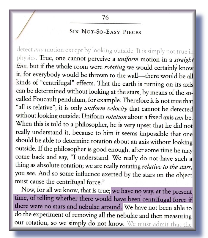 | There is no force of gravity present and there is no air. A person at position D will not feel the centrifugal effect unless they come into contact with the space station like at C. This is because there is no air to be pulled along with the rotation as it comes into contact with the inner rim. So if the person is standing on the rotating inner rim, they will stick to it because of the centrifugal force described by the vectors previously at A. Just like the black arrow in A, the centrifugal force will push the astronaut C down, against the space station and the blue tension arrow then pulls back at them, and artificial gravity is the result. There is just no way that a person floating in space at D will feel any centrifugal force. If the person floating in position D is not in contact with the space station, she will feel nothing However, friction will hold her to the inner rim if she is in contact with it at C. (The stars and nebulae surely have nothing to do with it! Take note of this!) It is just a vector calculation that requires one to try and envision what the invisible air (or lack thereof) is doing according to normal Newtonian calculations. Ah! Good old Newton; always reliable and vindicated to the end. It seems that the other theorists neglected the role that the air plays because it is invisible. If the space station starts to accelerate and then slowly spins from a stationary point, and the astronaut is in contact with the inner rim of the space station, then she will start to feel the centrifugal force. She will be able to stay standing on the inside of the space station as it accelerates. She will still feel the centrifugal force once the acceleration stops and a stable velocity is attained. So there is a force being applied to the astronaut even when there is no acceleration. The Ohanian Physics text book, only offers an account of centrifugal acceleration, and carefully omits any reference to the curious phenomenon of how the centrifugal force is still experienced when a body is spinning at a constant velocity! For a force to be present during acceleration is logical. But as Feynman points out, that a force should be present when velocity is constant (when there is no acceleration), is a bit inexplicable. I was made aware at quite a young age, that there was no valid explanation for the centrifugal force. How is it that a force can be felt when the velocity is constant and no force is being applied? Well, if we add up the force vectors of all the points on the compass, then the result will still be zero! But it seems quite clear to me that it is the friction of the moving inner surface that carries the air (and anything else it is in contact with) along with it; and the rest is a vector sum. So let us turn to Feynman’s account of the centrifugal force. |