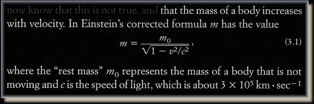 that there should be quite vast discrepancies in the mass of atoms. But as I have already shown, the concept of relative mass breaks down for a much simpler reason. The formula clearly states that there is a phenomenon termed: ‘rest mass’. But! In Relativity there is no such thing as ‘rest’ because the objects are moving relative to each other. Relative mass fails empirically and also in terms of its own internal logic. |