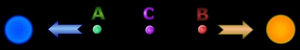 A and B are small bodies accelerating away from each other due to the force of gravity which is the result of the much larger yellow and blue stars.