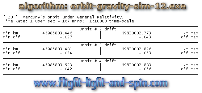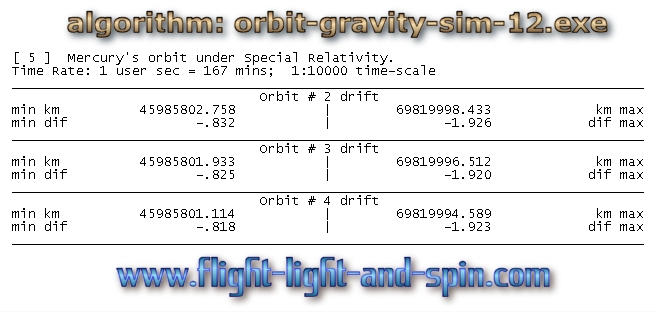 | Relativity and Mercury's orbit The easiest way to assess the accuracy of the orbits of the planets in the evolutionary algorithm OGS12 (orbit-gravity-sim-12.exe) is to observe Scenario [18] which shows the orbit of Mercury according to Newtonian gravity at a time-scale of 1:10 000. The user can freely download the algorithm and observe all this data evolving in real-time. The error-margin at this time-scale is 1 part in 40 million millions or 177mm after 20 orbits. That error-margin of 177mm is the difference in the distance from Mercury to the Sun after those 20 orbits at aphelion (maximum distance.) Next