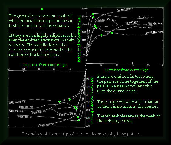 | Stars are not normally in a classical elliptical orbit for three reasons. Firstly, when orbiting a binary pair, the shape of the orbit is never elliptical. Secondly, having been thrown out beyond escape velocity, the stars are not in an orbit, as they spiral outwards. And thirdly, if the main binary pair fluctuates in highly elliptical orbits, this process causes the stars to be emitted at varying velocities. This is why in some cases the rotation curves are said to oscillate. In cases where the white-holes orbits’ are near-circular the velocity of the stars is constant beyond a point. This point is the very position of the white holes. The oscillation in the rotation curves thus represents the period of rotation of the white holes. |