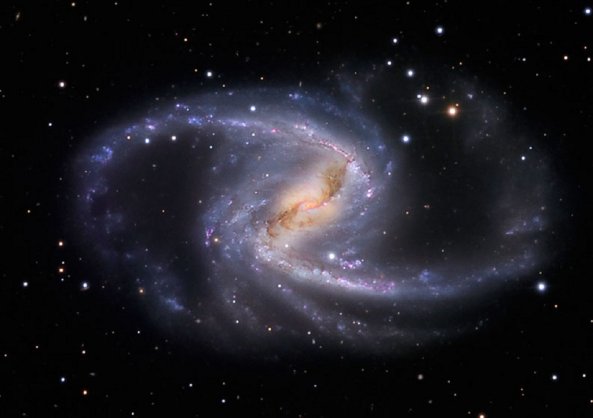 In a system with a single center of gravity, the orbital body is pulled back inwards, and therefore takes on the shape of a classical orbit. But when there are two centers of gravity, the main body moves away from the smaller orbital body, and so the gravitational force of the main body is greatly diminished. The star then rotates outward, often reaching escape velocity. The next image is a photograph is of spiral galaxy NGC 1365. Compare it to the computer generated image above. It is quite easy to see exactly where the two super massive bodies are situated: |