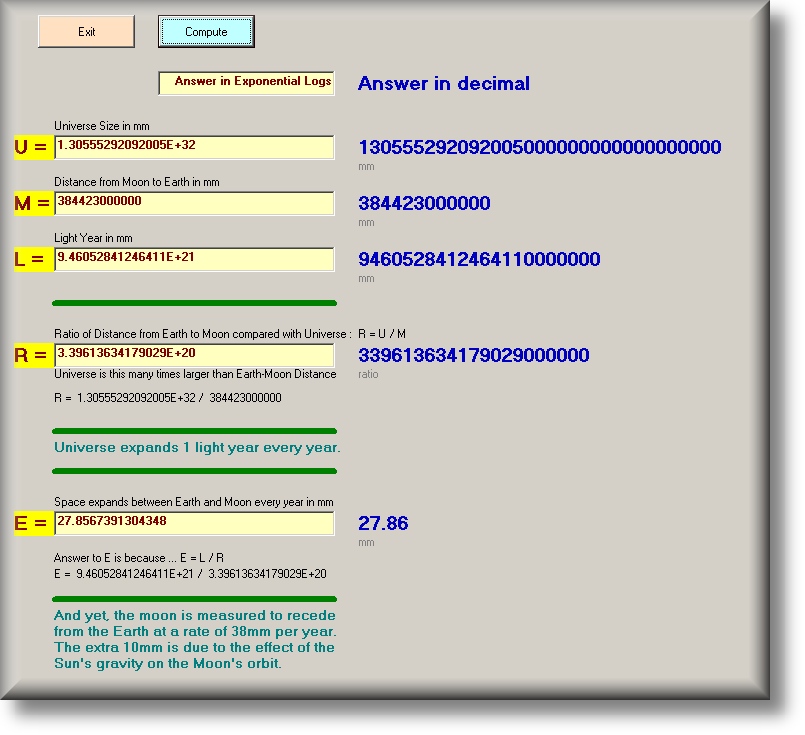 | On the rgphiloscience.forumotion.com forum 'Leo' inspired me to realize that Moon recedes from the Earth due to the expanding universe. So I wrote a bit of software to see to what extent it does this. Here is the screenshot of the program: |